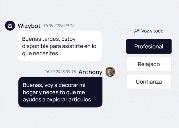 Wizybot se adapta a tu marca: personaliza su apariencia, comportamiento, acento y estilo de comunicación. Tu tienda, tu estilo.